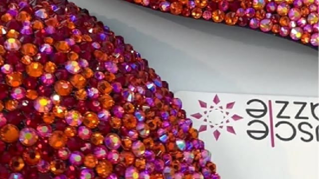 This exciting berry red wellness suit is creatively crystalled with vibrant hyacinth, red and black crystals on a black fabric.