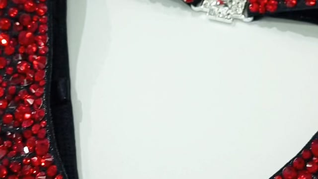 This glamorous Red And Black Figure Suit is decorated with a stylish burst of red and dark red crystals on a black fabric.