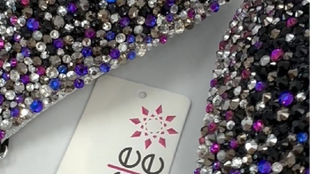 This beautiful black aurora competition bikini features an opulent blend of clear, silver, dark silver, black and iridescent purple crystals on black fabric.