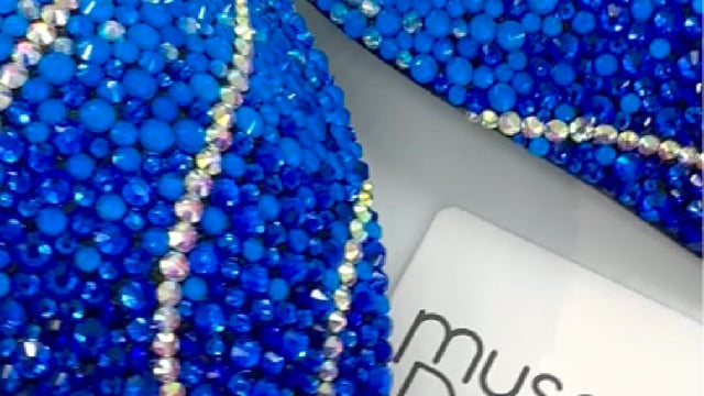 This breathtaking Blue Mirage Figure Suit is crystalled with a stunning blend of crystal AB, sapphire AB, neon blue, sapphire and dark blue crystals on a chic black fabric.