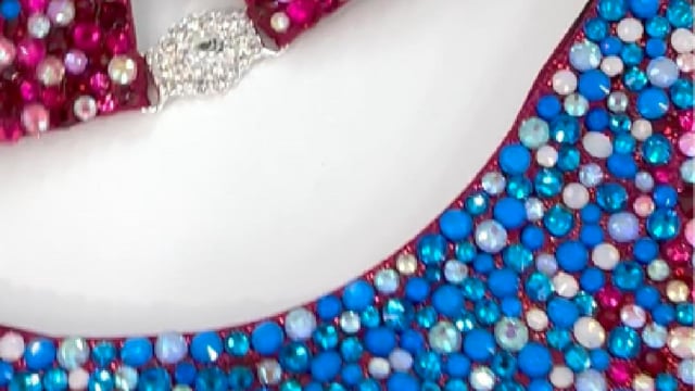 This intense Blue Mirage Wellness Suit is decorated with a striking blend of white opal, 3 shades of blue, pink, peach and red crystals on a red fabric.