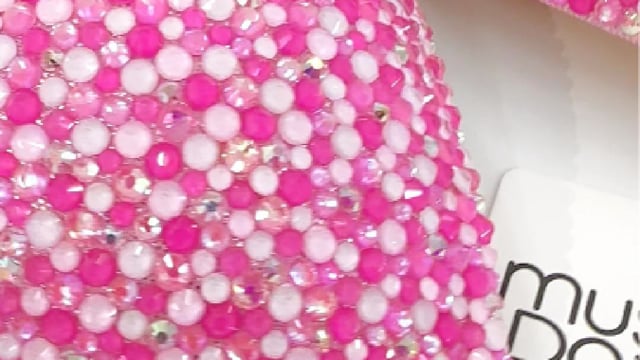 This must-have Bubblegum Figure Suit is delightfully decorated with a mix of pink and clear AB crystals combined with 3 shades of neon pink crystals on a light pink fabric.