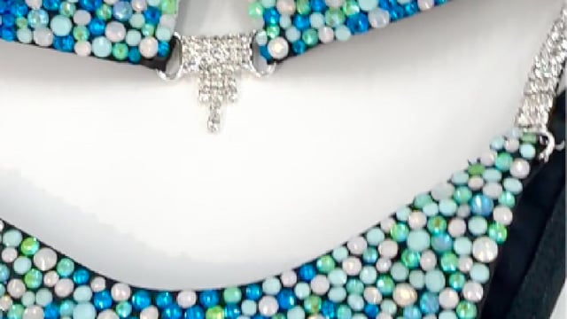 This luxurious caribbean glow wellness suit is crystalled with striking white opal, mint, light green, blue and dark blue crystals on black fabric.