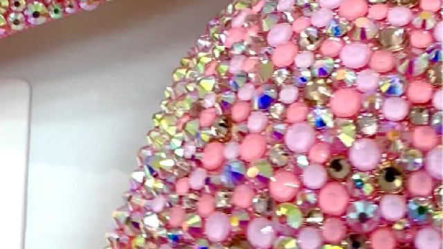 This elegant Champagne Rose Figure Suit is decorated with crystal AB, coral, pink and peach crystals on a fabulous pink salmon fabric.