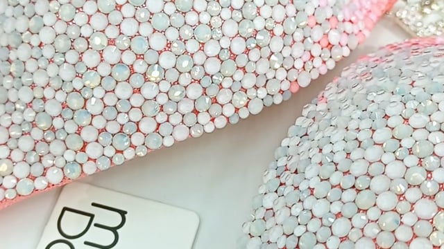 This sophisticated Coral Frost Wellness Suit is decorated with an inspired combination of white opal, white, neon pink and neon coral crystals on pink fabric.