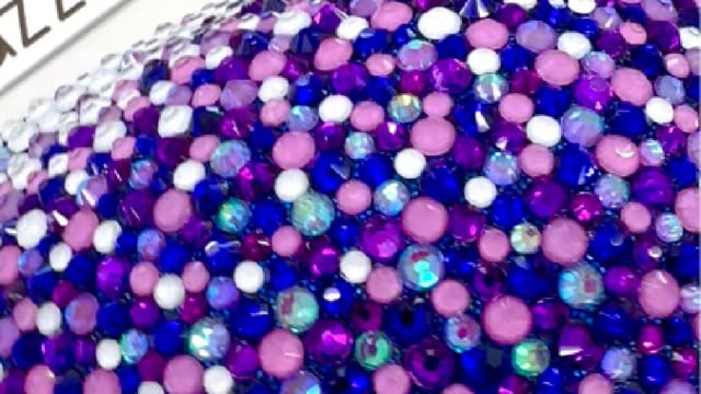 This intensely elegant dark violet figure suit features a beautiful combination of hand-placed white, purple, berry, violet and dark blue crystals on a deep blue fabric.