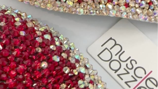 Step on stage in this deep red competition bikini, adorned with a gorgeous blend of crystal AB, gold, red and dark red crystals on a black fabric.