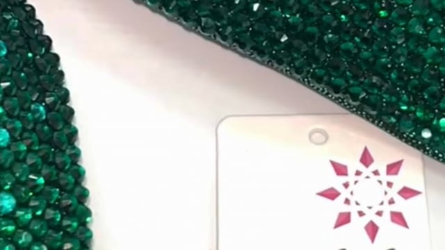 This Emerald Aura Figure Suit is decorated with a magical mix of emerald and peacock green crystals on a gorgeous green fabric.