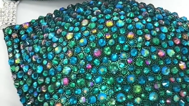 Stand out in this Emerald Eclipse Figure Suit, adorned with stunning peacock green, peacock AB, green volcano and blue zircon crystals on a chic green fabric.