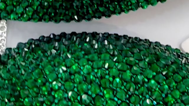 This fabulous emerald green competition bikini features emerald crystal rhinestones on a matching emerald green fabric.