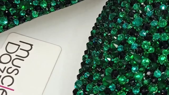 This elegant emerald figure suit is the perfect combination of sophistication and sparkle with its a mix of two shades of green and jet black crystals on a holographic green fabric.