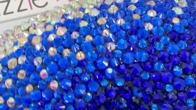 Embrace the allure of this sapphire blue figure suit, sparkling with clear, golden, blue, dark blue and black crystals on an elegant black fabric.