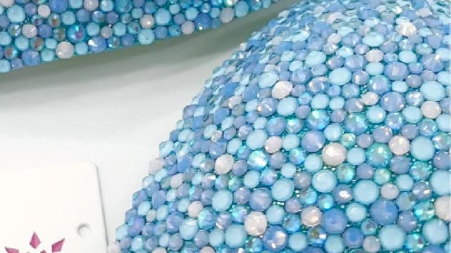 This captivating cyan blue figure suit features an exquisite mix of 3 shades of blue plus white opal crystals on a cute celeste fabric.
