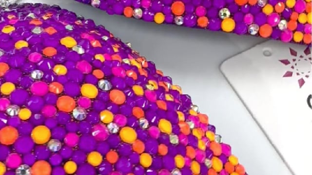 This purple flame figure suit is decorated with a majestic mix of crystal AB, amber, orange, pink, purple and violet crystals on fuchsia fabric.