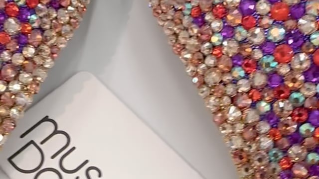 This stylish Twilight Flame Figure Suit is decoratede with a vibrant blend of light and dark gold, amber,violet, blue AB and dark blue crystals on a deep purple fabric.