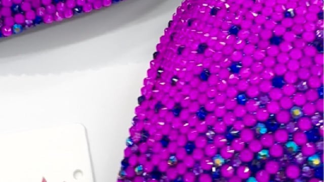 Be irresistible in this fuchsia wellness suit, with a striking mix of blue, amethyst and fuchsia crystals on a blue fabric.