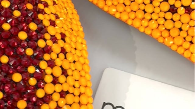 This vibrant Golden Flame Wellness Suit wellness competition suit is beautifully crystalled with a dramatic combination of neon orange, red, dark red and black crystals on a black fabric.