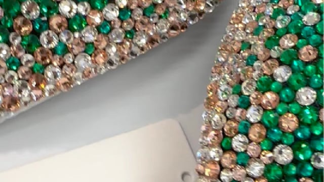 This stylish green figure competition suit is encrusted with crystal AB, champagne, green, emerald and black crystals on a jet black fabric.
