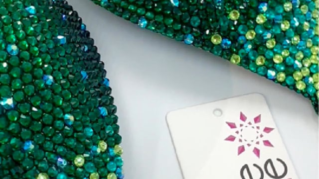 This gorgeous green wellness suit shines with 4 different shades of green rhinestones on green fabric.