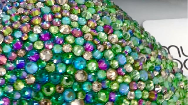 This Iridescent Ivy Competition Bikini is decorated with an eye-catching mix of champagne gold and 4 shades of green crystals (including neon AB and iridescent) on a green fabric.