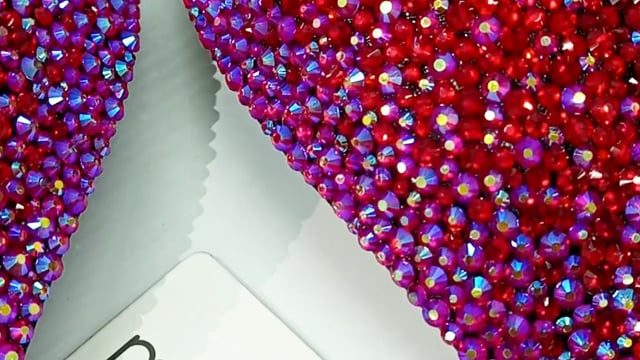 This Midnight Ruby Figure Suit is adorned with an mesmerizing blend of red AB, red, dark red and black crystals on black fabric.