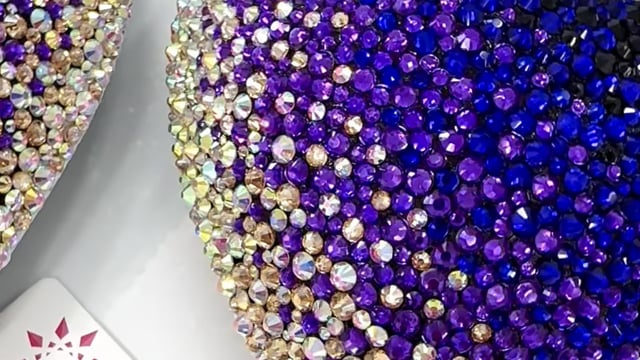 Hit the stage in this exciting Midnight Violet Figure Suit, crystalled with an eye-catching mix of crystal AB, gold shadow, purple, dark blue and black crystals on a black fabric.