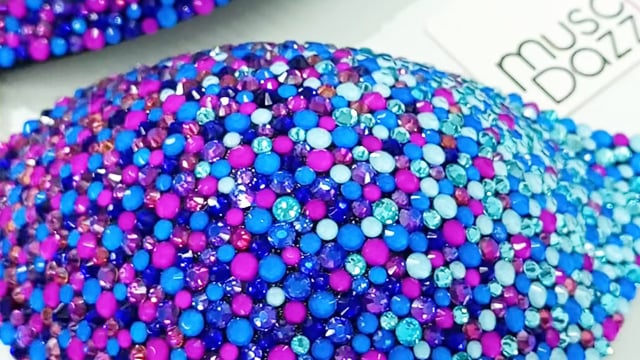 This Moonlit Amethyst Competition Bikini is decorated with a striking ombre blend of neon blue, neon light blue, aqua blue, neon amethyst, purple and cobalt blue crystals on a black fabric.