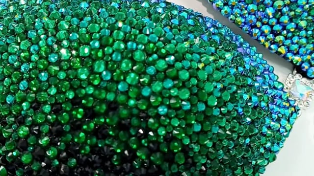 This enchanting Mystic Jade Competition Bikini is crystalled with an beautiful blend of peacock blue, peacock green, emerald and black crystals on black fabric.