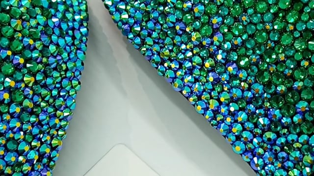 This enchanting Mystic Jade Figure Suit is crystalled with a blend of peacock blue, peacock green, emerald and black crystals on a black fabric.