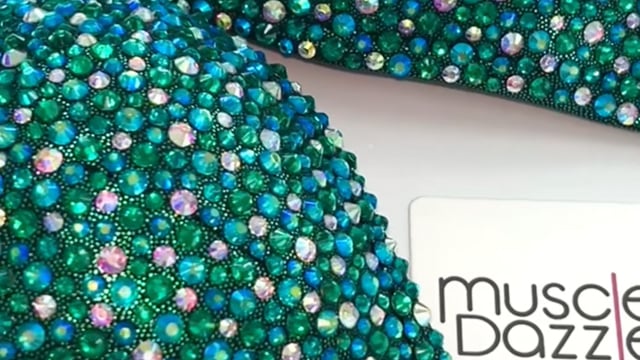 This Mystic Mermaid Figure Suit features an exquisite mix of crystal AB, peacock AB and peacock green rhinestones on a green fabric.