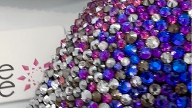 This ravishing Mystic Night Figure Suit dazzles with a mix of crystal, silver, dark silver, black and iridescent purple crystals on a black fabric.