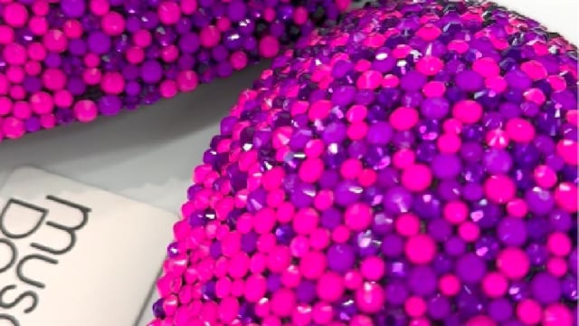 Turn heads on stage in this Neon Orchid Competition Bikini, featuring neon pink, neon purple, violet and black crystals on black fabric.