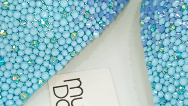 This vibrant Ocean Breeze Figure Suit is decorated with a dramatic blend of light blue, blue opal, clear crystal AB crystals on a cute turquoise fabric.