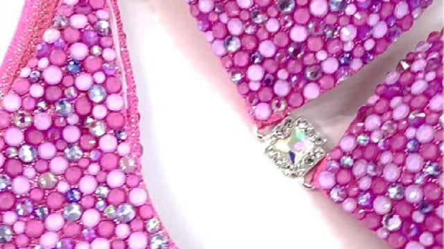 This striking orchid pink wellness suit is crystalled with a beautiful blend of violet, purple and berry crystals on a super cute pink fabric.