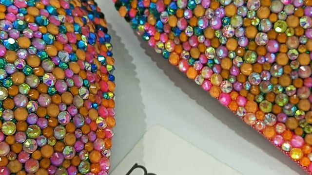 This exquisite Peacock Glow Figure Suit is decorated with an exciting mix of orange, hyacinth, blue-green, peacock, emerald and crystal AB crystals on a green fabric.
