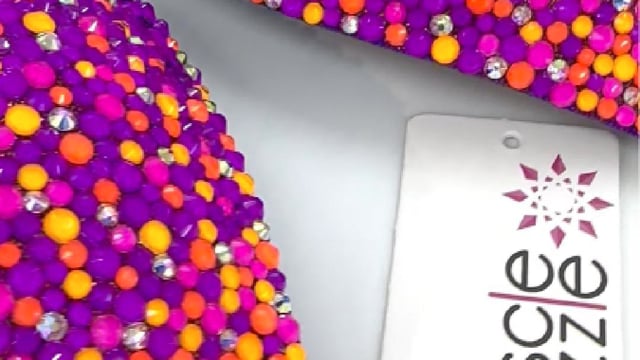 This exciting purple flame competition bikini is decorated with a striking blend of crystal AB, amber, orange, pink, purple and violet crystals on fuchsia fabric.
