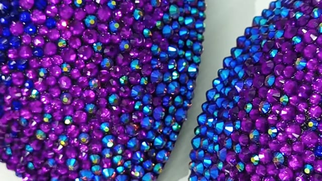 This enchanting Purple Galaxy Competition Bikini is decorated with a mesmerizing blend of amethyst AB, violet, dark blue and black crystals on black fabric.