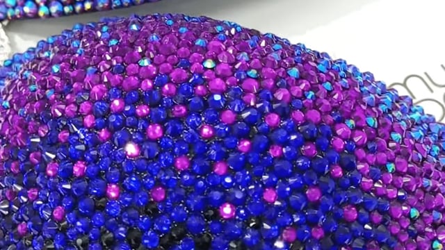 This glamorous Purple Galaxy Figure Suit is decorated with a stunning blend of amethyst AB, violet, dark blue and black crystals on a black fabric.