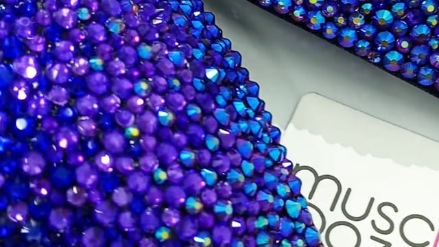 This fabulous Purple Mirage Figure Suit is decorated with a super stylish mix of amethyst AB, blue-purple, dark blue and black crystals on a black fabric.