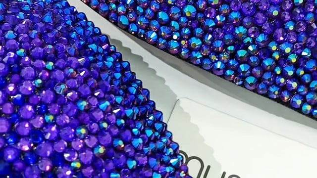 This Purple Mirage Wellness Suit is embellished with a striking blend of amethyst AB, blue-purple, dark blue and black crystals on a black fabric.