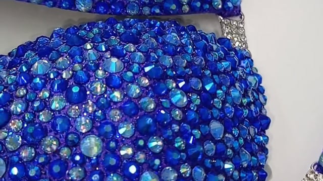 This chic Purple Sapphire Competition Bikini is decorated with a vibrant combination of sapphire AB and light sapphire AB crystals on a cute purple-blue fabric.