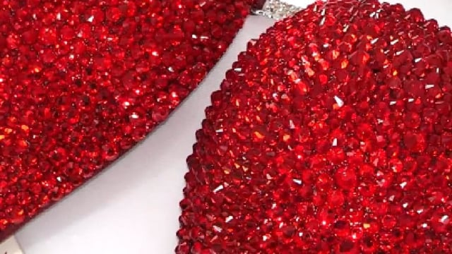 This bold red bikini competition suit sparkles with randomly spaced red crystal rhinestones on a bright red fabric.