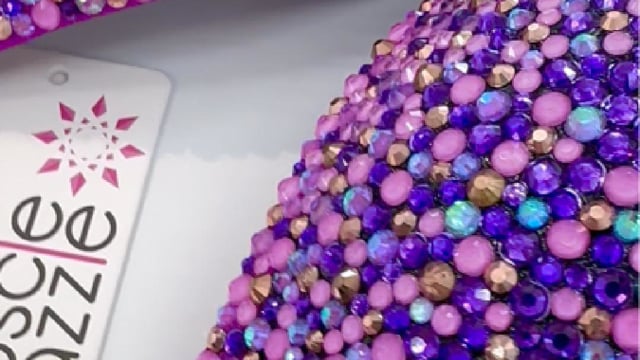This glamorous royal orchid wellness suit is beautifully decorated with radiant purple, berry, amethyst, dark blue and rose gold crystals on black fabric.