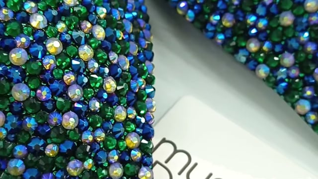 This stunning Sapphire and Emerald Figure Suit is decorated with an exquisite mix of emerald green, olive green AB and metallic blue crystals on a green fabric.