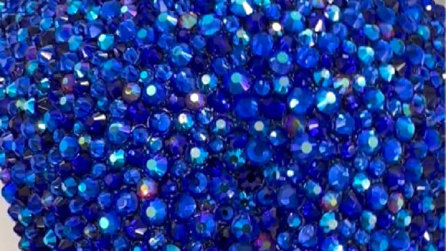 This striking Sapphire Dream Wellness Suit is embellished with a beautiful blend of deep blue, sapphire, sapphire AB and amethyst AB crystals on blue fabric.