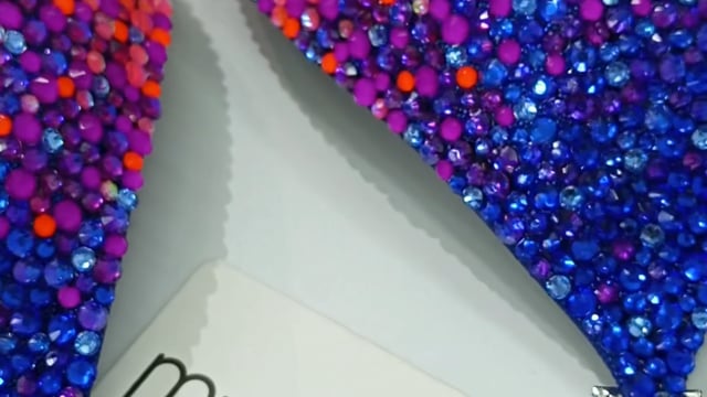 This Sapphire Inferno Figure Suit is decorated with an exciting blend of sapphire, light sapphire, purple, neon orange, neon orange AB and neon amethyst crystals on blue fabric.
