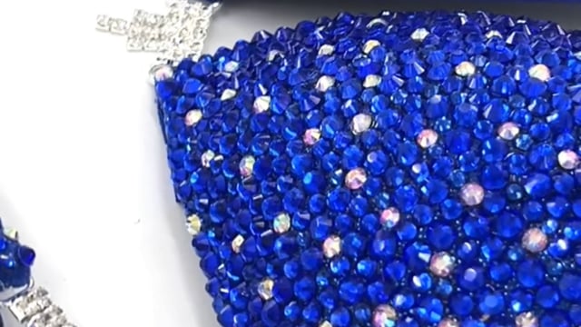 This dramatic Sapphire Nova Wellness Suit is studded with crystal AB and sapphire blue crystals on a classic blue fabric.