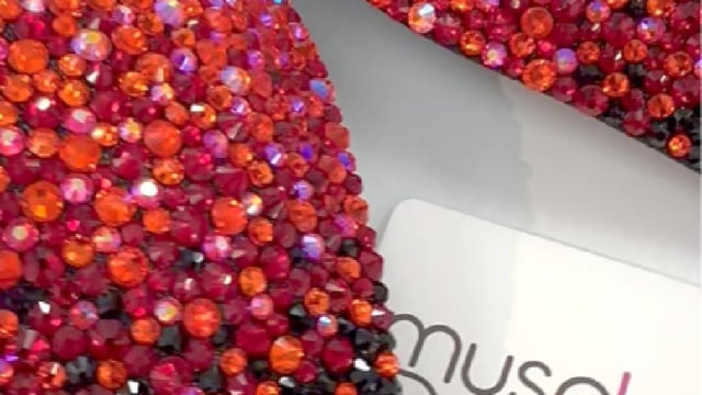 This vibrant Scarlet Shadow Wellness Suit is decorated with a mix of orange AB, orange, red and black crystals on a black fabric.