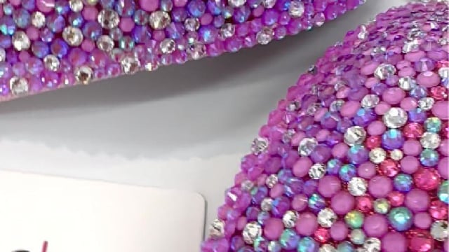 Be the definition of chic in this twilight rose figure suit, adorned with clear, pink, peach, rose, berry and dark red crystals on red fabric.