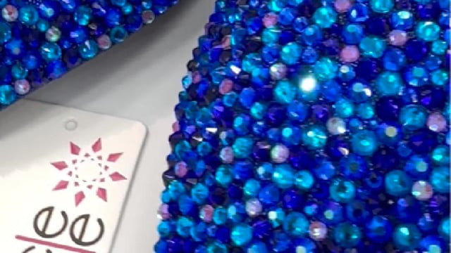 This dazzling Twilight Sapphire Wellness Suit is brilliantly crystalled with 4 different blue crystals with purple highlight crystals on a blue fabric.